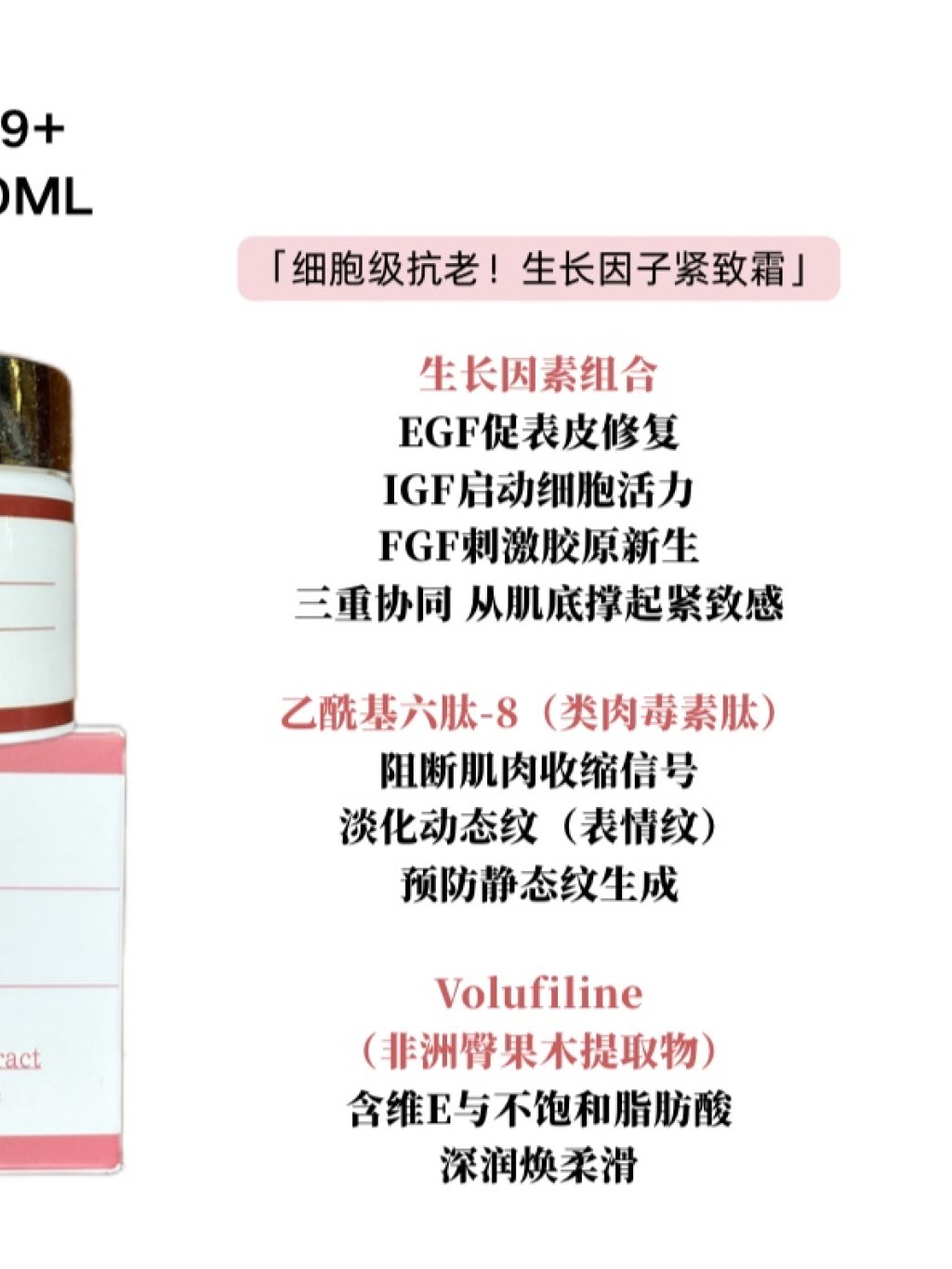 3GF (EGF、FGF、IGF) 1.EGF:具有祛班去艘,抗皮唐老化,預防色斑的功效。使皮南無得飽和, 有彈性。