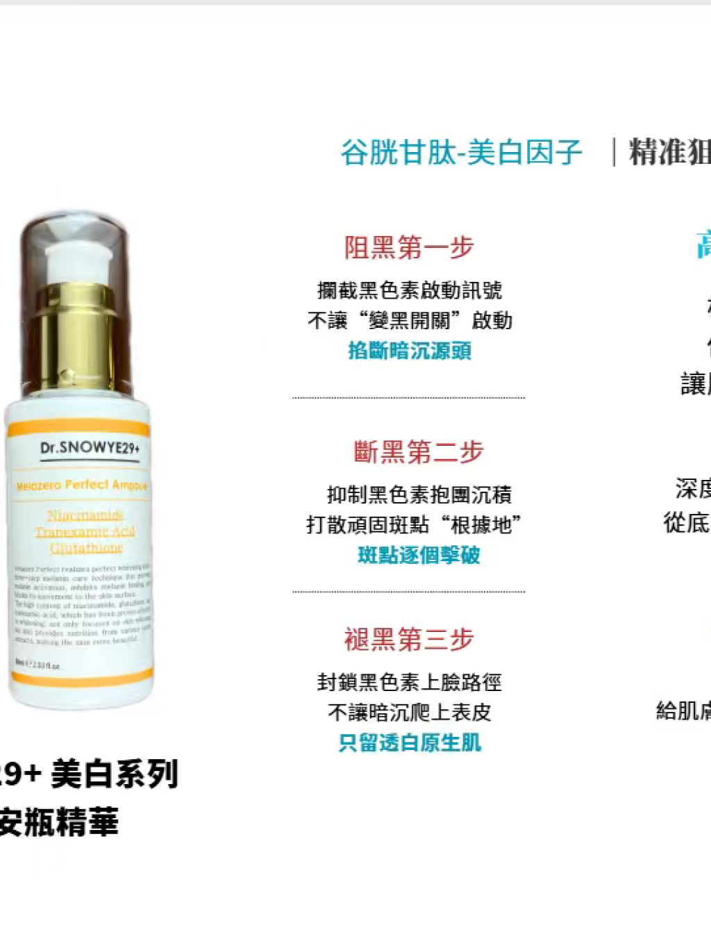 最強美白去斑成份集合於一瓶精華中 強調效果更快更強! DR.SNOWYE 29+只選擇對美白明顯有效的成分, 並慷 慨地用料。