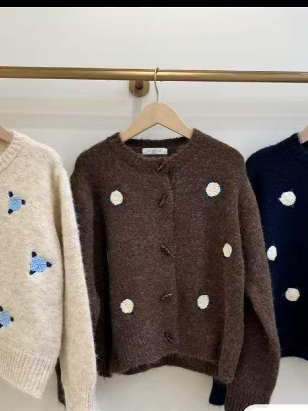 🇰🇷MO26 刺繡花牛角鈕冷衫(3色)