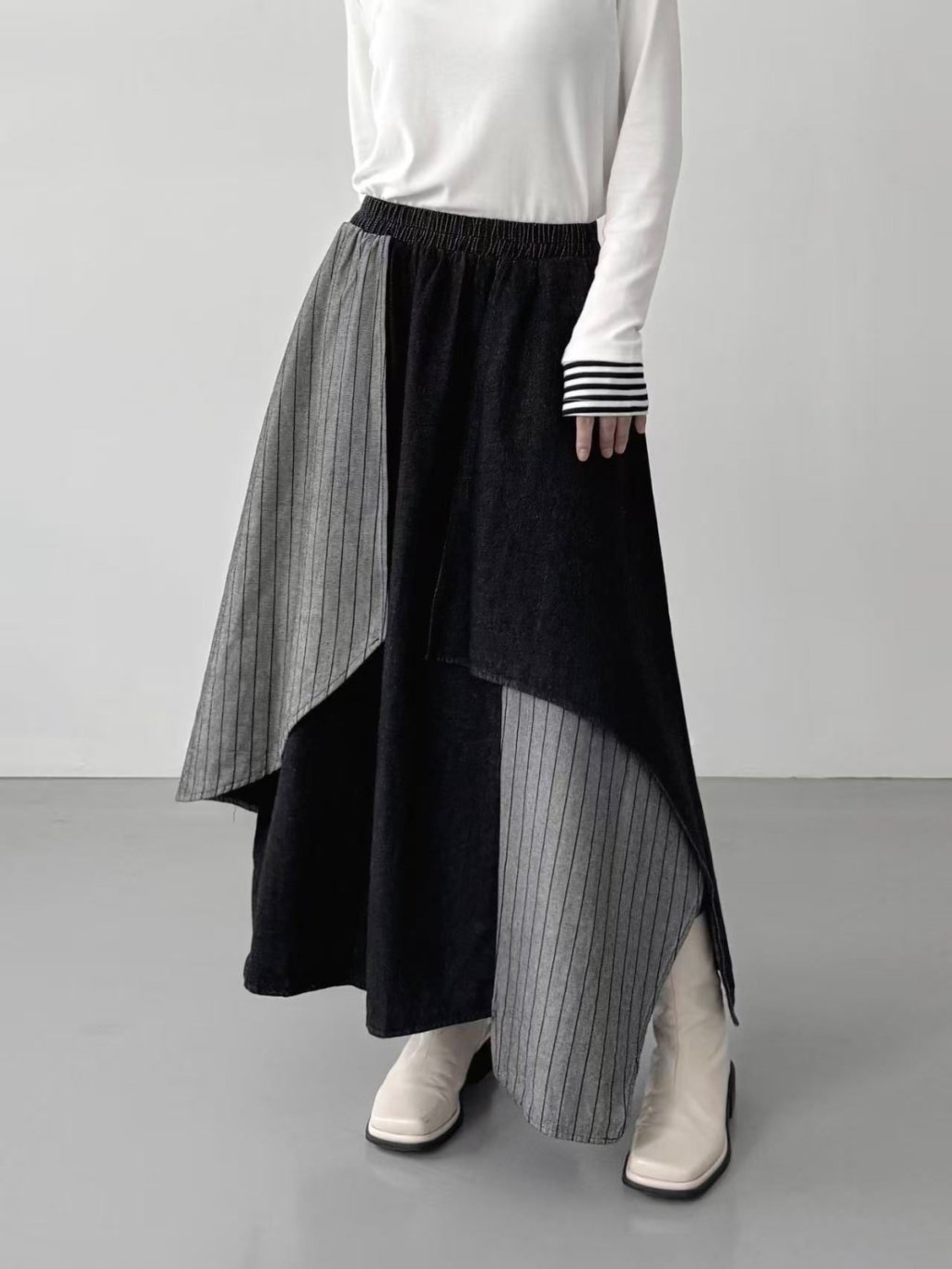 🇰🇷BE09 直紋拼牛仔不規則長裙