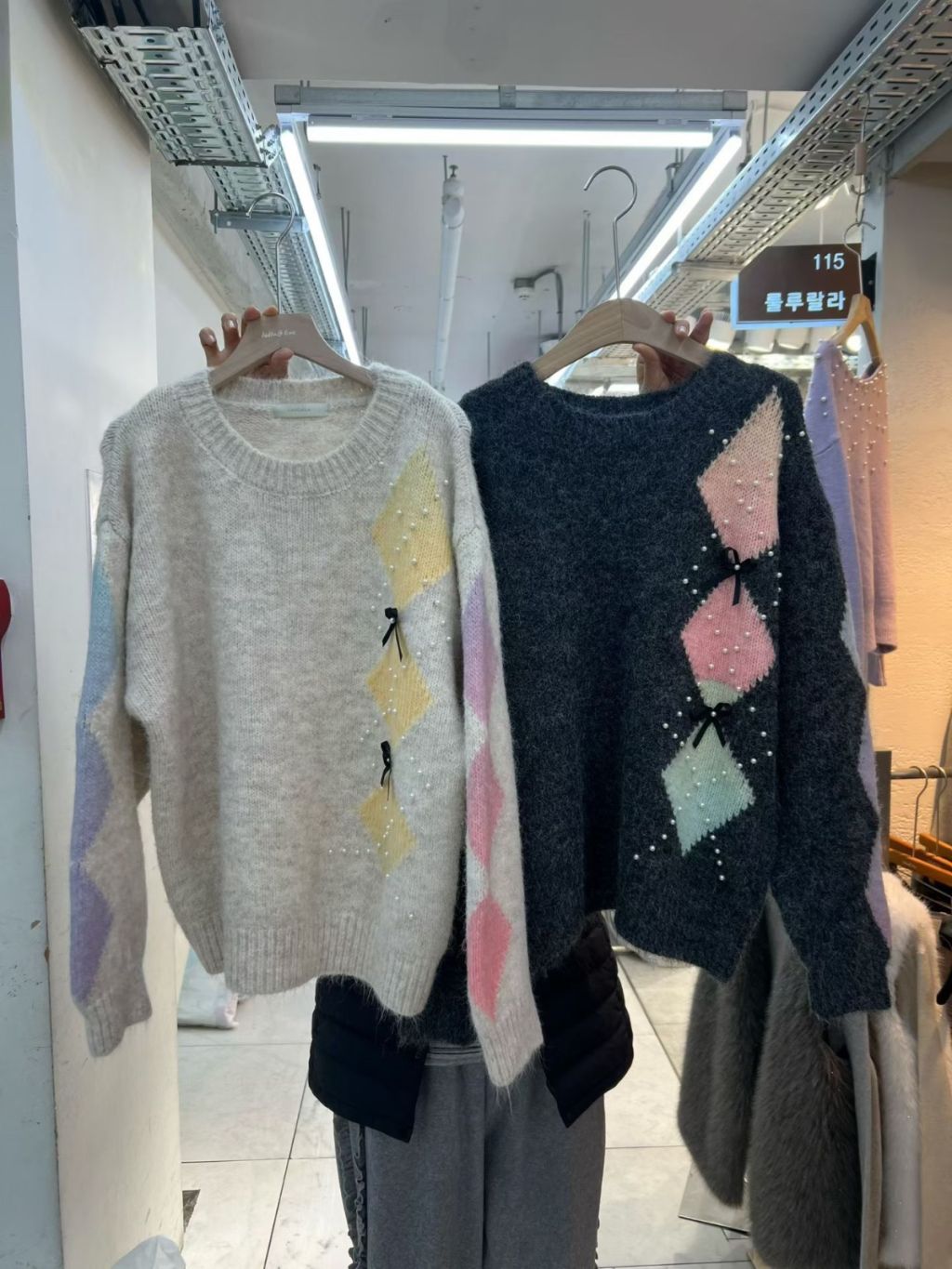 🇰🇷LU05 菱格紋小蝴蝶結珍珠綑邊冷衫(2色)