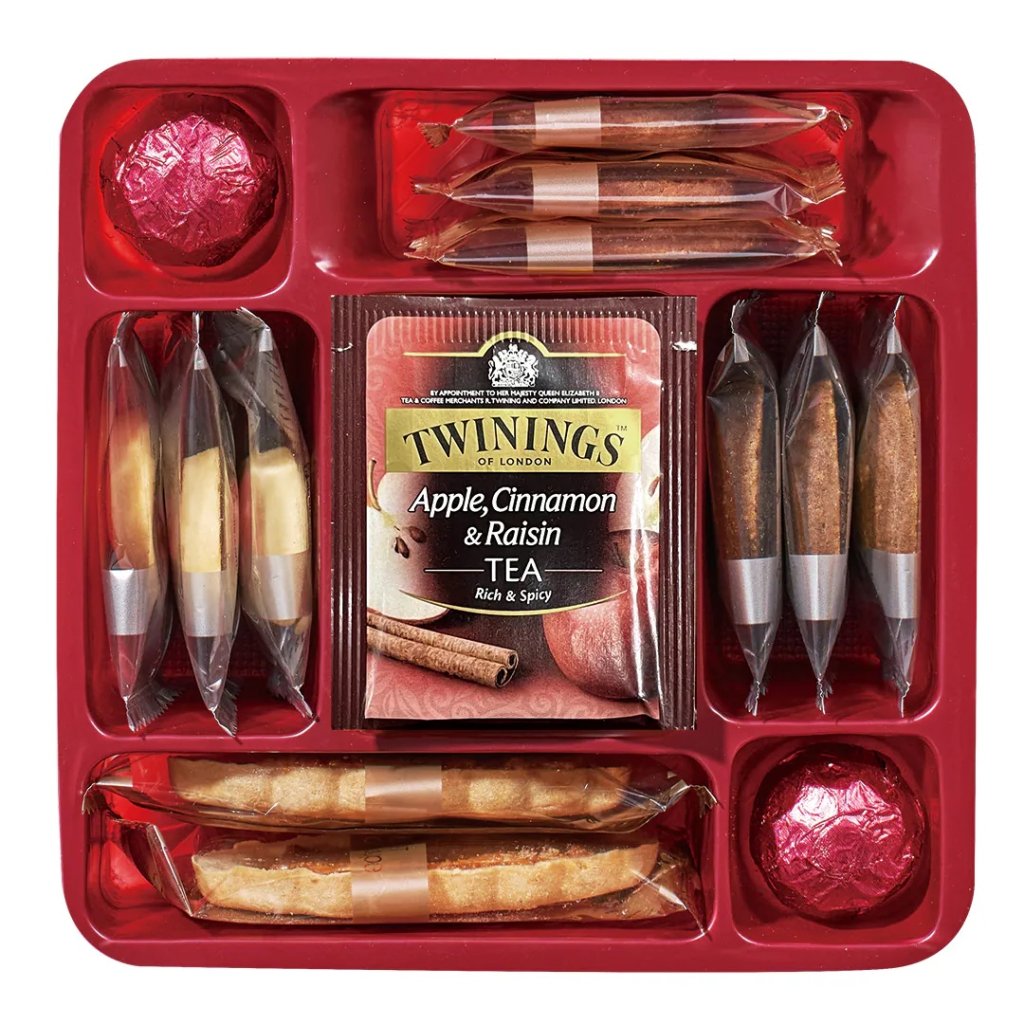禮盒內容:咖啡杏仁曲奇 x 3, 阿薩姆茶曲奇 x 3, 甜心牛油曲奇 x 3, 焦糖杏仁船 x 2, 榛子味朱古力 x 2, 川寧蘋果肉桂葡萄乾茶 x 2