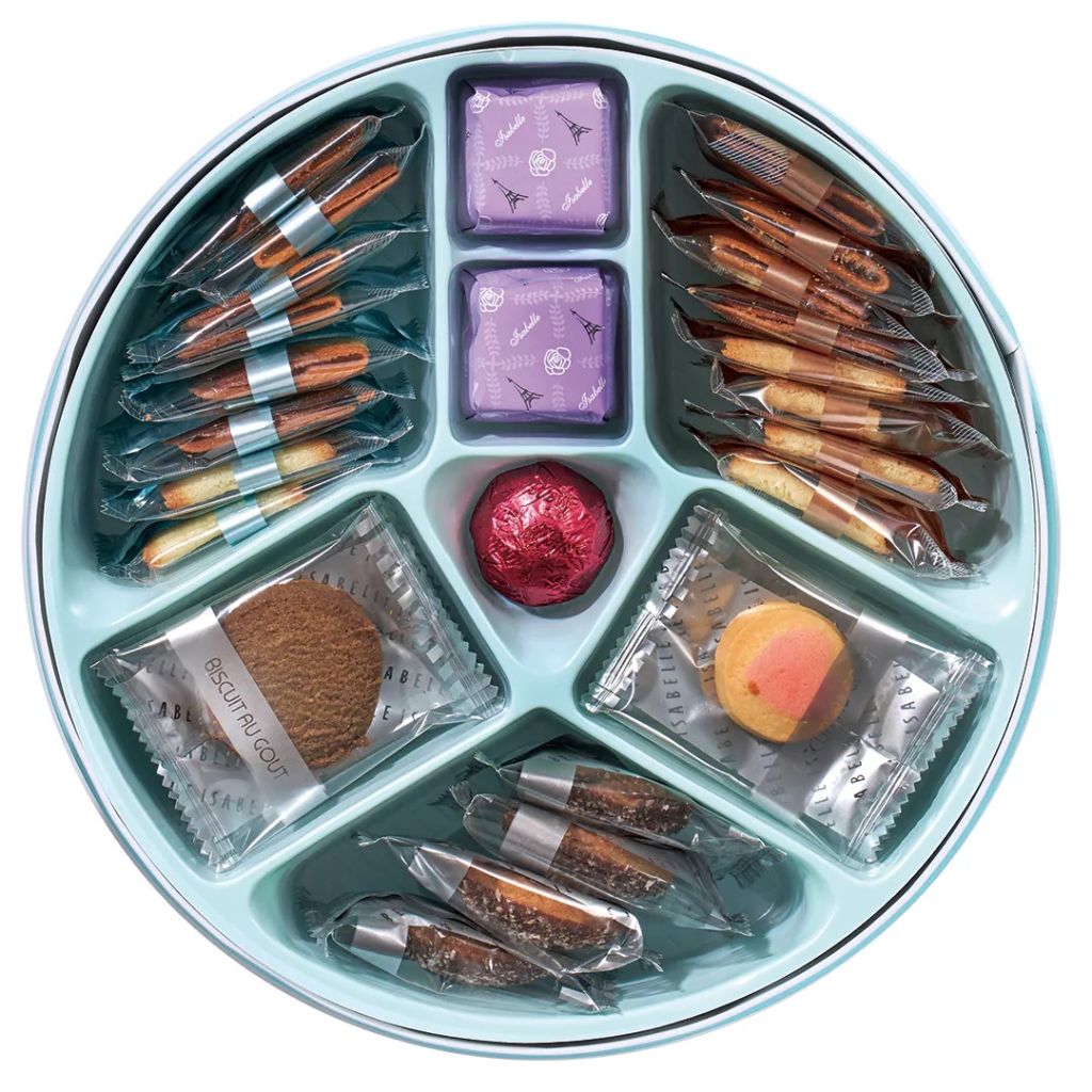 禮盒內容:阿薩姆茶曲奇 x 3, 椰絲朱古力曲奇 x 4, 甜心牛油曲奇 x 3, 雲呢拿味薄餅 x 8, 芝士薄餅 x 8, 藍莓味酥 x 2, 榛子味朱古力 x 1