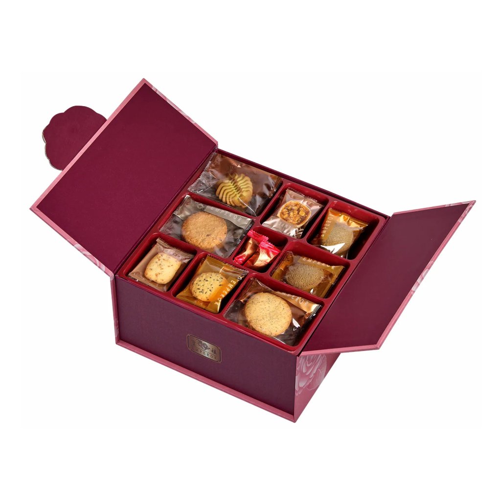 下層:葉形抹茶曲奇 x 3, 咖喱酥 x 3, 無糖黃金全麥曲奇 x 2, 烏龍茶曲奇 x 8, 玄米茶曲奇 x 4, 芝麻曲奇 x 4, 全麥柑橘曲奇 x 3, 香濃牛奶太妃糖 x 3